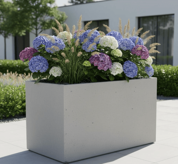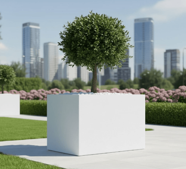 Aukštos kokybės lauko vazonas, pagamintas iš architektūrinio betono, sutvirtinto trimis skirtingų tipų armatūromis ir skaidulomis, kas garantuoja išskirtinį atsparumą ir tvirtumą.